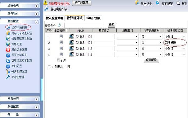2.3 在“监控配置->监控电脑列表”里,选中要封堵的主机和封堵策略级别,保存配置并应用封堵策略,如下图所示: