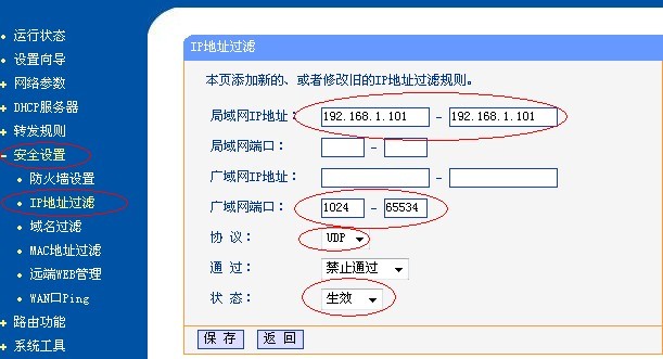 2.1 配置路由器,封堵UDP端口1024-65534。打开“安全设置->IP地址过滤”,新增规则,如下图所示:
