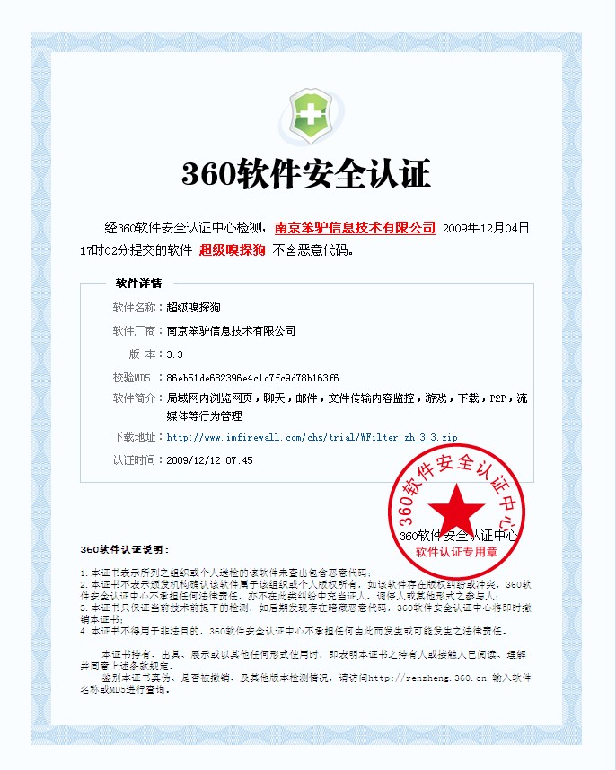 通过该认证表明WFilter(超级嗅探狗)是不含有“恶意代码”的网络监控软件,让网民能够信任开发者及其软件,更容易找到优秀的软件,不再为其功能而放弃安全性。
