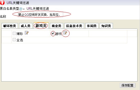 5.在新增级别,网页封堵选项卡中,勾选URL关键词过滤,选择禁止QQ空间好友买卖、抢车位、游戏基地,如下图所示: