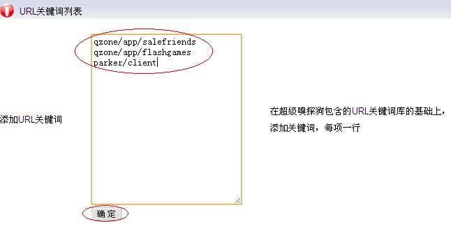 3.添加URL关键词qzone/app/salefriends,qzone/app/flashgames和parker/client,如下图所示: