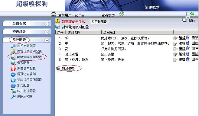 4.在“监控配置-- >封堵策略级别配置中”新增级别,如下图所示: