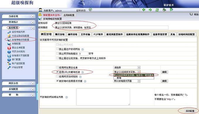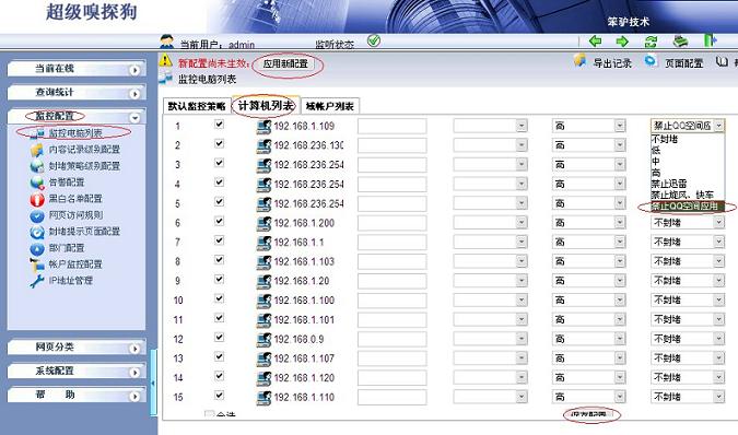6.在“监控配置-- >监控电脑列表”中应用封堵策略,如下图所示: