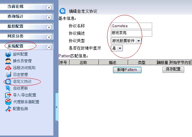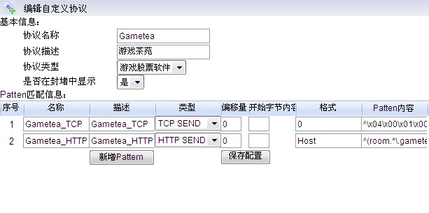 1.1 在“系统配置->自定义协议”中点击“ 新增自定义协议”增加一个自定义协议,命名为Gametea,协议类型选择“游戏股票软件”,如下图所示: