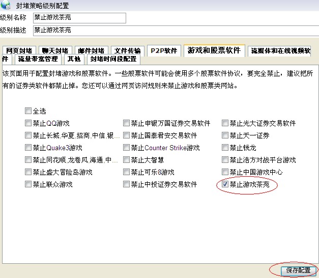 1.3 在“监控配置->封堵策略级别配置”点击“ 新增级别”,级别名称为禁止游戏茶苑,在“游戏和股票软件”选项卡中增加了用户自定义的“禁止游戏茶苑”选项,选中“禁止游戏茶苑”的复选框点击保存。如下图所示: