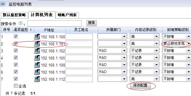 1.4 在“监控配置->监控电脑列表”里,选中要封堵的主机和封堵策略级别,保存配置并应用封堵策略,如下图所示: