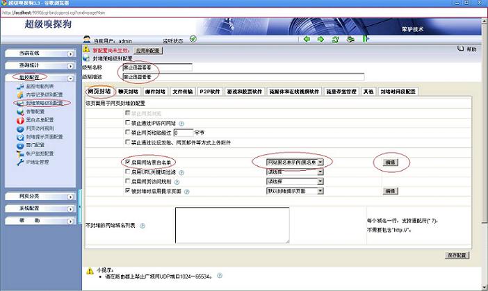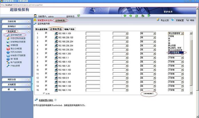 2.在“监控配置-- >监控电脑列表-- >计算机列表”中应用封堵规则,如下如所示: