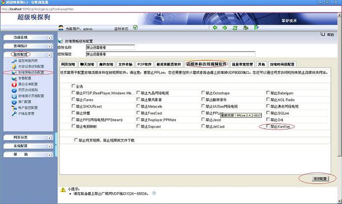 1.打开超级嗅探狗,在“监控配置-- >封堵策略级别配置-- >新增级别-- >禁止迅雷看看”,配置如下图所示: