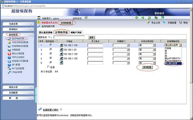 (2)在“监控配置-- >监控电脑列表-- >计算机列表”中应用封堵规则,如下图所示: