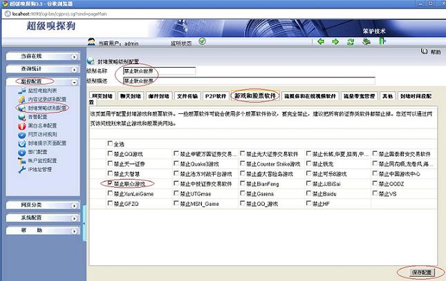 (1)打开超级嗅探狗,在“监控配置-- >封堵策略级别配置-- >编辑-- >禁止联众世界”,配置如下如所示: