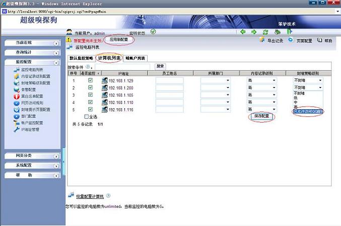 3.在“监控配置-- >监控电脑列表”中应用封堵策略,如下图所示: