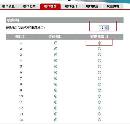 本例中,端口1设置为“被镜像端口”接路由器,端口17设置为“镜像端口”接WFilter监控主机。即可实现监控。