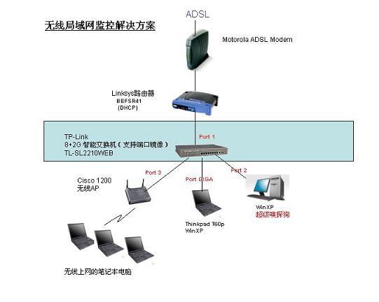 在本例中,为了能同时对有线环境的机器和无线环境的机器进行监控。我们增加了一个TPLINK的镜像交换机(TL-SL2210WEB)。并且需要对无线AP进行设置。 如上图中框内部分。