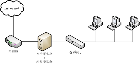 “网桥”使用两块网卡,可以透明串接在网络中,不需要修改其他电脑的配置就可以对网络进行监控管理。